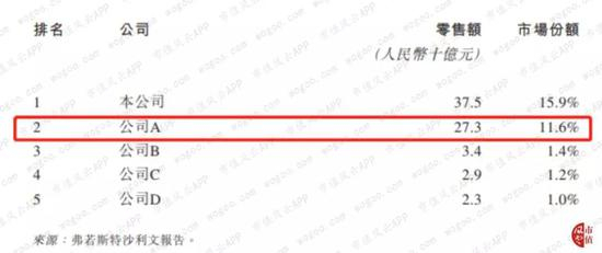 根据滔搏国际的招股说明书,2018财年(注:以2019年2月28日作为2018财年最后一天)销售额为375亿元,市场份额为15.9%,排名第一。