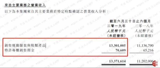 公司将收入来源分为两类,一类是销售运动服装与鞋类产品,二类是特许专柜销售佣金。运动鞋服的销售占据收入的大头,2019年上半年占比99.5%。