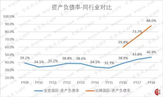 宝胜国际的资产负债率自2015年开始逐年增长,从32.7%上升至46.9%。滔搏国际的负债率更高,2016-18期间滔搏国际的资产负债率从59.8%一路飙升至88%。
