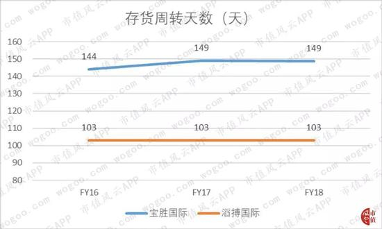 宝胜国际的存货周转天数始终高于滔搏国际近乎50天,2018年宝胜国际存货周转天数为149天,而滔搏国际仅为103天。虽然宝胜国际存货周转天数高于滔搏国际,但是优于行业平均的180天。