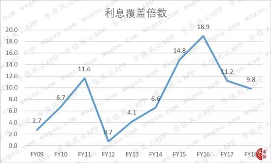 公司的利息覆盖倍数近两年有所下滑,但是2018年也有9.8,远高于1,流动性强,不存在利息偿付压力。
