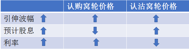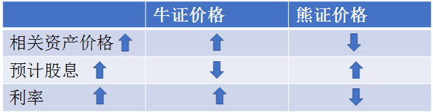 一般,当预计股息上升的时候,认购证价格下跌,认沽证价格上涨。而当利率上升的时候,认购证价格上涨,认沽证价格下跌。