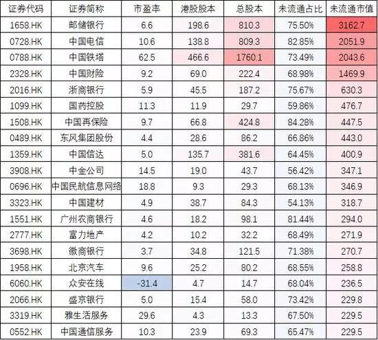 其中,非流通市值最高的为邮储银行的3163亿港元,其次为中国电信和中国铁塔超2000亿市值的未流通股。该三家企业的非流通股本分别占75.5%、82.85%和72.49%,占比明显较高。