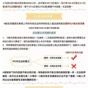 1)对企业来讲。A:提高公司治理水平、改善H股结构。天风证券指出,全流通改革使得内资股股东可以无需通过VIE架构就直接在香港市场减持,将会吸引更多的内陆公司通过H股的模式赴港上市,对改善H股的结构带来帮助。川财证券表示,“全流通”扩大H股融资渠道,完善企业治理、提升估值水平。