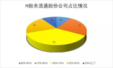 在这161家H股中,合计149家公司的非流通占比超过50%,这意味着在所有的H股中,几乎全部的上市公司的股权结构为非流通股为主。其中占比超过80%的有12家,占比在70%-80%之间的有27家,占比在60%-70%之间的高达41家,占比50-60%的有23家,而占比不足50%只有的11家,非流通股份占比最小的为富贵鸟(3.88, 0.00, 0.00%)的9%。