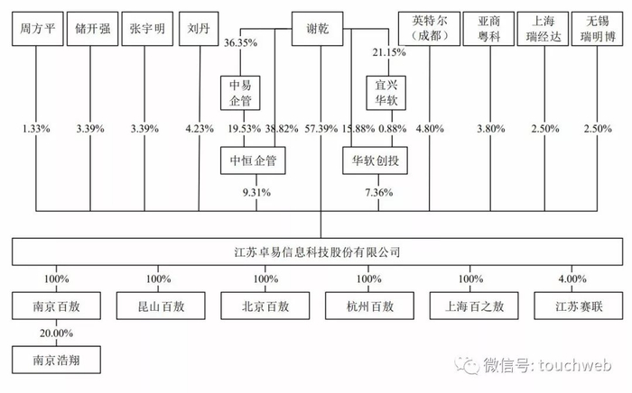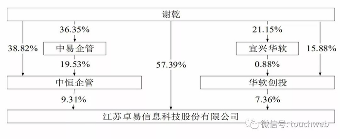 卓易信息控股股东为谢乾,IPO前,谢乾直接持有公司57.39%股份、间接持有公司5.46%的股份,合计持有公司62.85%的股份。