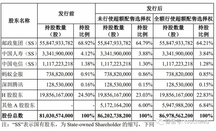 IPO前,邮政集团持有邮储银行55,847,933,782股内资股股份,占本次A股发行前总股本的68.92%。