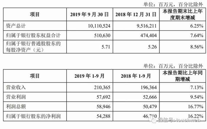 截至2019年9月30日,邮储银行资产总额为101,105.24亿元,较2018年末增长6.25%,归属于银行股东权益为5,106.30亿元,较2018年末增长7.64%。