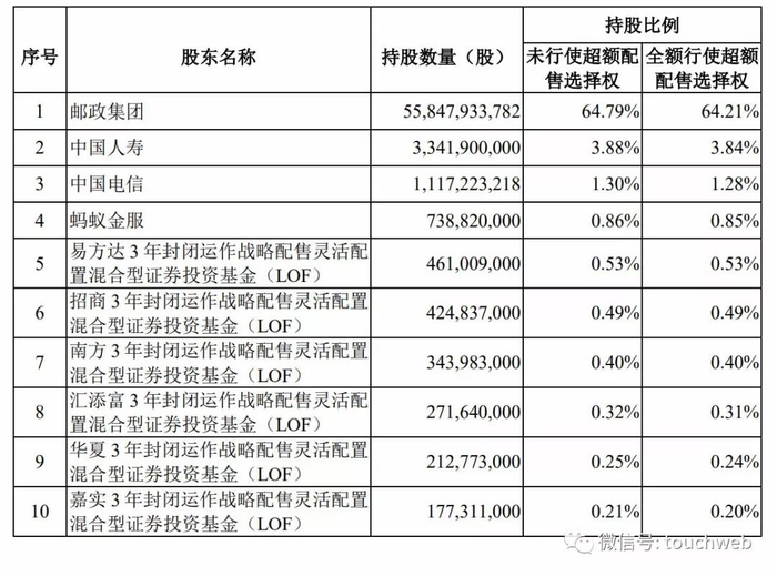 IPO后,邮政集团持有邮储银行股权降至64%,依然为最大股东。中国人寿持股为3.8%,中国电信持股约为1.3%,蚂蚁金服持股约为0.85%。
