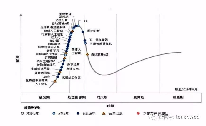 在这个曲线中可以看到一个非常有趣的点,这个点叫近地轨道卫星系统,这个点超越人工智能、可解释人工智能、拟人化,超过很多比较近的领域的发展,它叫近地轨道卫星系统。