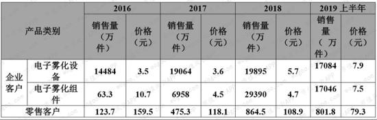 从售价来看,2016-2019年中,公司对企业客户的电子雾化设备涨价幅度近126%,加热不燃烧设备组件随销售规模上升单价有所下滑。