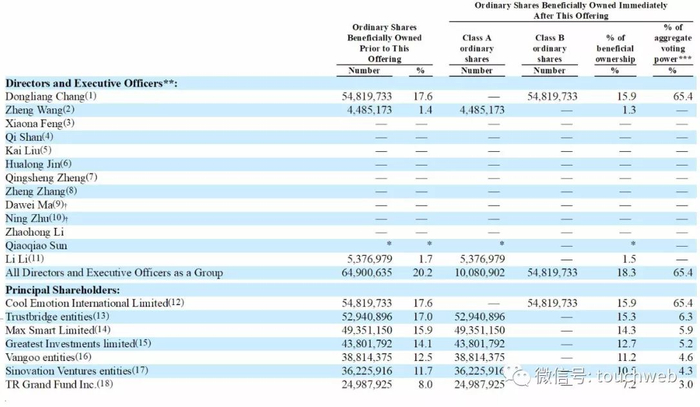 IPO前,常东亮持股为17.6%,为大股东;王征持股为1.4%,挚信资本持股为17%,红杉资本旗下Max Smart Limited持股为15.9%;