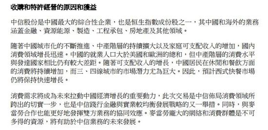 中信股份2017年收购麦当劳中国时的公告