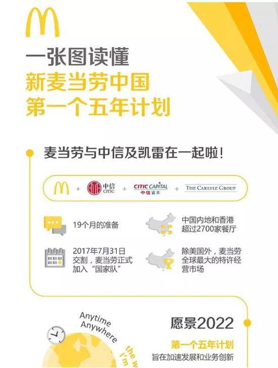 在上述收购完成交割之后,2017年10月,麦当劳中国火速改了一个接地气的名字——“金拱门”。与此同时,麦当劳中国还提出了第一个五年计划。
