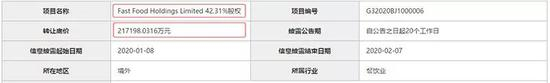 1月8日,北京产权交易所披露,Starry Dream Investments Limited拟转让Fast Food Holdings Limited(下称“Fast Food”)42.31%股权,转让底价约21.72亿元人民币。