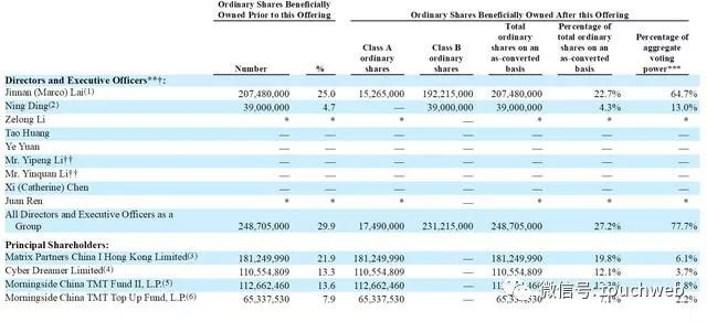 IPO后,赖奕龙持股为22.7%,拥有64.7%的投票权;Ning Ding持股为4.3%,拥有13%的投票权;