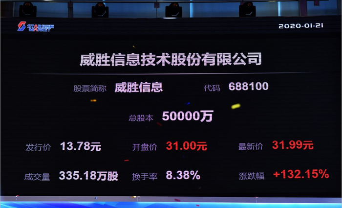 威胜信息技术股份有限公司(证券代码:688100,简称“威胜信息”)昨日在科创板上市,发行价格13.78元,募资6.89亿元。