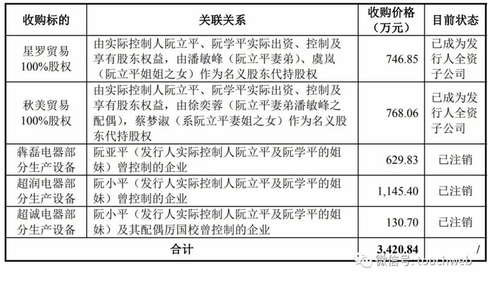 报告期内,公牛集团为减少关联交易,收购了星罗贸易、秋美贸易100%股权,以及收购了关联公司犇磊电器、超润电器和超诚电器三家公司部分生产设备,总金额为3420万元。