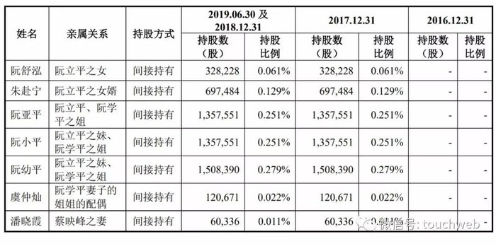 潘晓霞系阮立平妻子潘晓飞的姐,其间接持有发行人发行前0.011%股权;蔡映峰系潘晓霞的配偶,其间接持有发行人发行前0.028%股权;