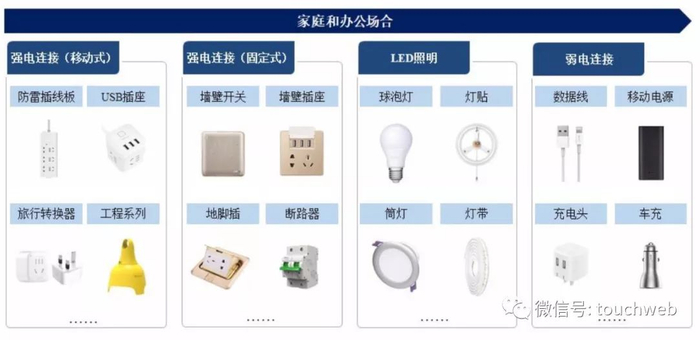 公牛集团专注于以转换器、墙壁开关插座为核心的民用电工产品的研发、生产和销售,主要包括转换器、墙壁开关插座、LED照明、数码配件等电源连接和用电延伸性产品,广泛应用于家庭、办公等用电场合。