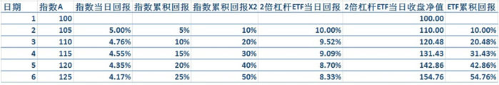先看单边上扬走势:假设指数连续上涨5日,中间没有回撤,那么当指数的累计回报达到50%时,两倍杠杆做多回报已经达到54.76%,超过指数25%收益的两倍。