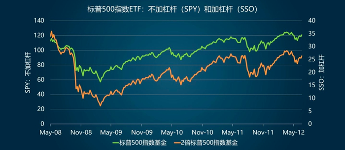 考虑到现实世界中,指数行情的上下往复几乎是必然的,因此长期来看,杠杆ETF的杠杆磨损相当大。以2008年5月到2012年5月这5年间的收益来看,当标普500指数在5年期间0收益时,2倍杠杆做多标普500的杠杆ETF却每年亏损5%,损耗还是相当大的。