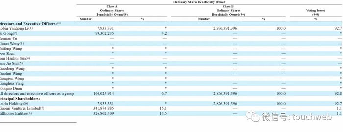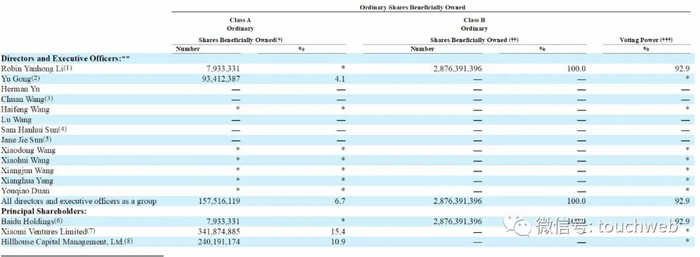 截至2019年2月28日,百度持有爱奇艺7,933,331股A类普通股,及2,876,391,396股B类普通股,拥有92.9%的投票权。