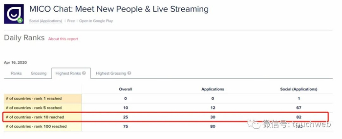 据App Annie数据,MICO曾登上71个国家/地区的App Store社交下载量排行榜第一,并闯入82个国家/地区的Google Play社交下载榜前十。