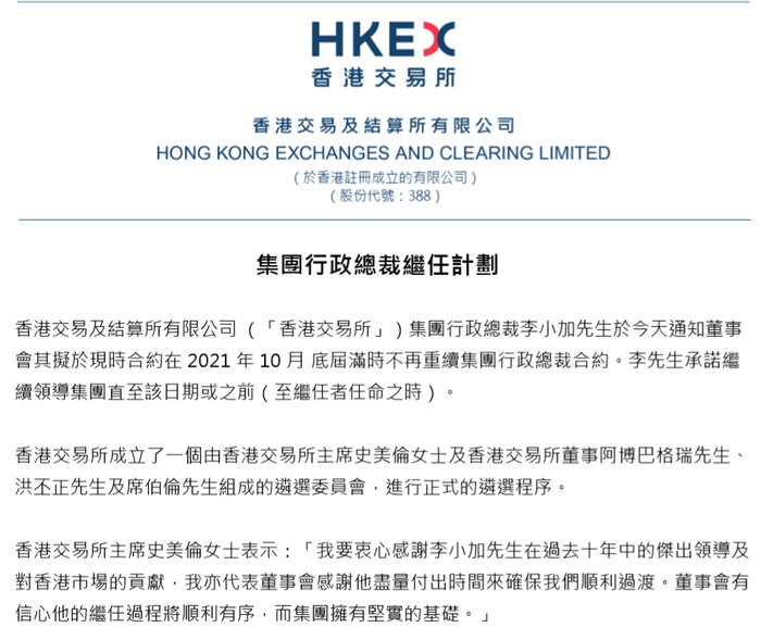 港交所当日表示,已成立了一个由港交所主席史美伦及港交所董事组成的遴选委员会,进行正式的遴选程序。