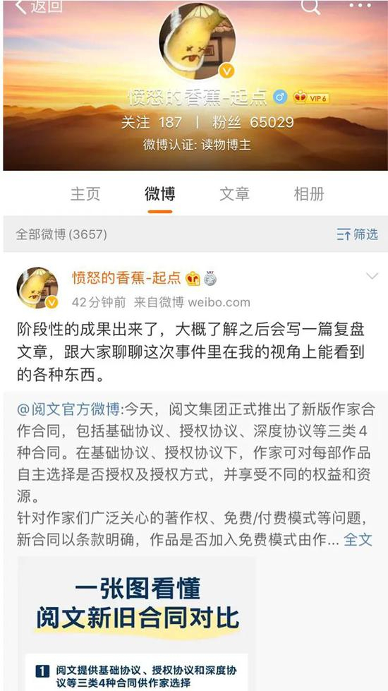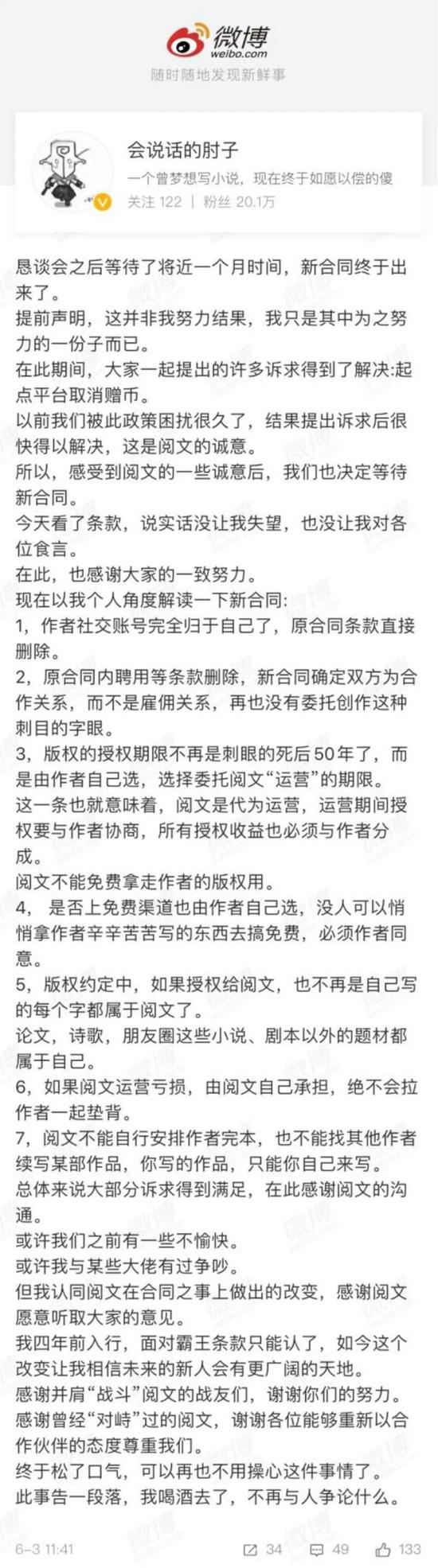 参与恳谈会的网文作家“会说话的肘子”在微博里表示,认同阅文在合同之事上做出的改变,并坦言,“我四年前入行,面对霸王条款只能认了,如今这个改变让我相信未来的新人会有更广阔的天地。”