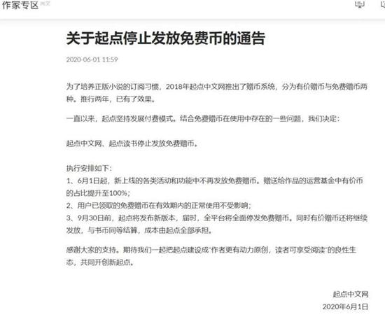 与此同时,作家群体反对声较大的“起点免费币发放”问题也已经在6月1日被官宣“停止”。