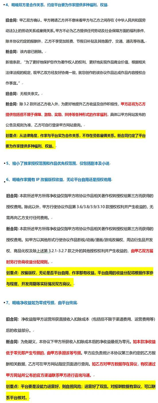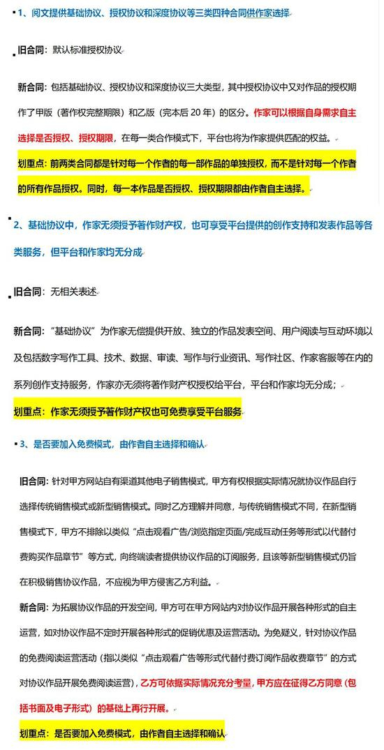 新合同还以条款明确,作品是否加入免费模式由作者确认。强调著作人身权属作者,平台与作家属合作关系,并提供多种福利权益。