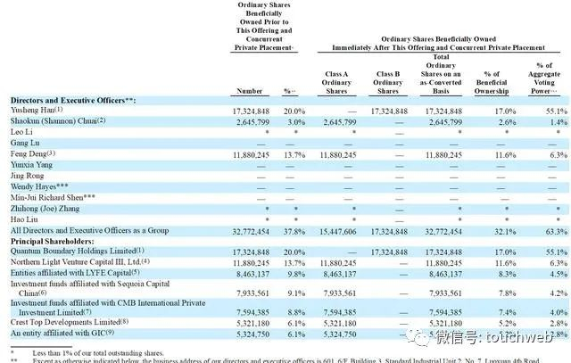北极光创投持股为11.6%,为第二大股东,有6.3%的投票权;红杉资本持股为7.8%,有4.2%的投票权;CMB持股为7.4%,有4%的投票权。
