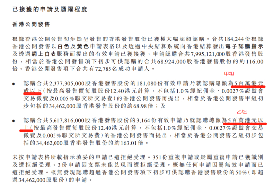 以思摩尔国际为例,公开发售接获认购股份总计7,995,121,000股。其中甲组申购人数为181,080人,总共申购34,462,000股,超额认购倍数为68.98倍;