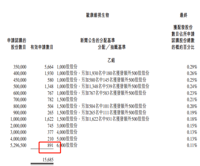 比如说欧康维视初始公开发售10,593,000股,那么顶头槌对应的认购股数就是5,296,500股,而欧康的顶头槌足足有891张!每张顶头槌能获12手(6000股)。