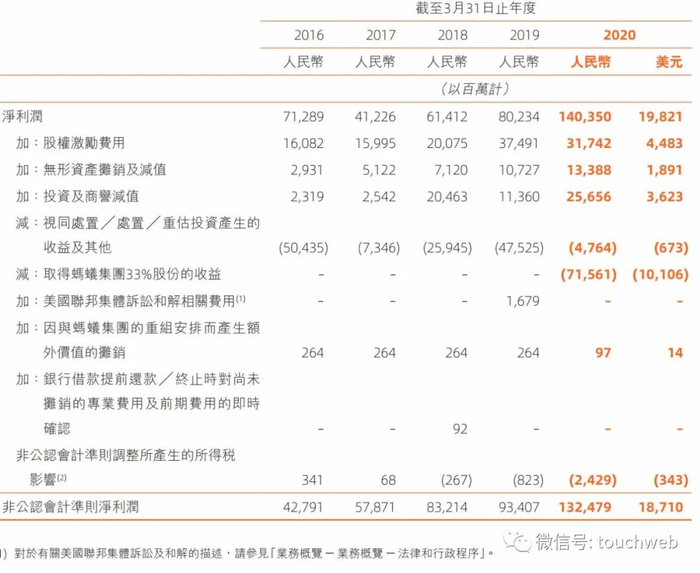 于2020财年,阿里与蚂蚁集团的利润分成安排下的许可使用费和软件技术服务费为38.35亿元(5.42亿美元),2019财年为5.17亿元。2019年9月阿里取得蚂蚁集团33%股份后利润分成安排亦即终止。