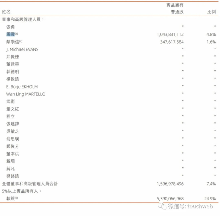 报告显示,截至2020年7月2日,阿里巴巴创始人马云持股降至4.8%,蔡崇信持股降至1.6%。软银持股降至24.9%,软银仍为阿里巴巴最大股东。