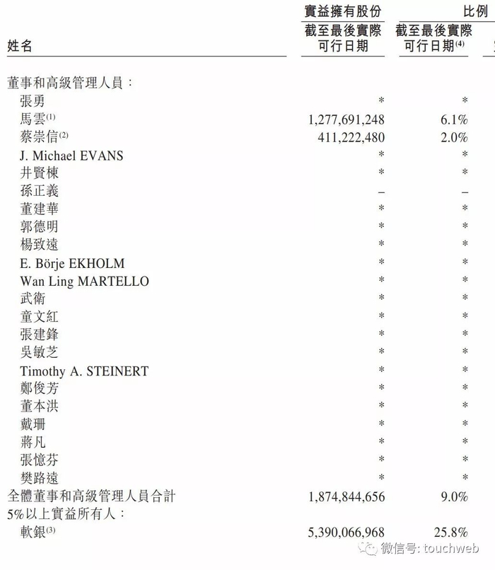 马云和蔡崇信分别实益拥有阿里巴巴约6.1%和约2.0%股权。