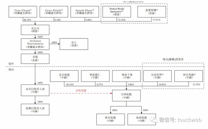 IPO前,CrescChorus持有46.39%股权,GreenParticle持股8.1%,SmoothEbony持股4.9%,完美世界持股23.1%,腾讯持股17.51%。