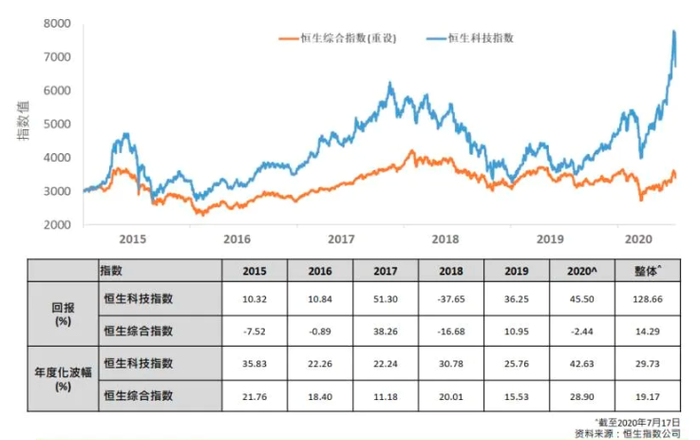 根据数据回溯,恒生科技指数于2019全年及2020年上半年的回报分别高达36.2%及35.3%。2015年至2020年7月17日期间,恒生科技指数回报率整体升128.66%,高于恒生指数的14.29%,整体表现优于大市。
