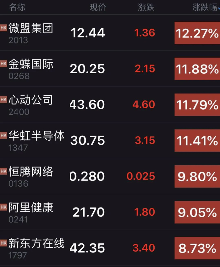 截至发稿,微盟集团、金蝶国际、心动公司、华虹半导体涨超10%,其余各股也都有不错涨幅。