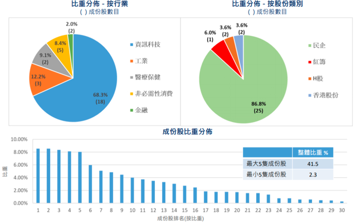 具体从行业分类来看,30只成分股主要分布在资讯科技业、非必需性消费、工业、医疗保健业和金融业中,其中资讯科技业有18家,占比最大达60%;从目前的成分股比重分部来看,资讯科技占比最大,达到68.3%。其次为工业,占比12.2%。