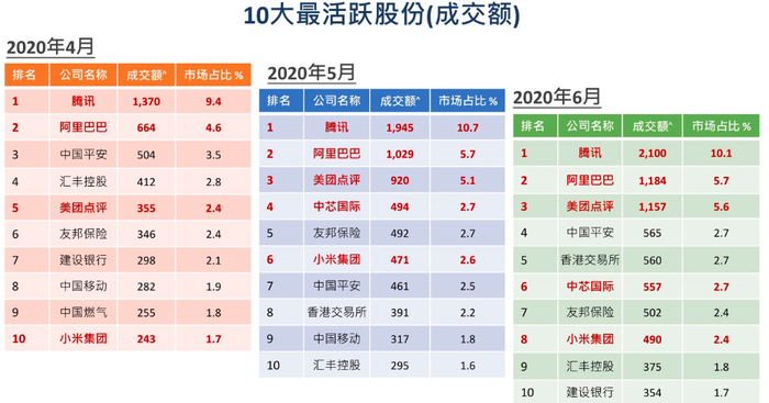 成交额方面也体现出相同的趋势,港股前十大活跃股份中,科技行业总占比不断提高。