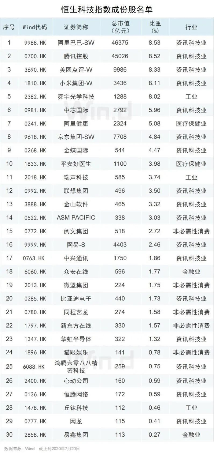 经上述筛选后,市值最大的 30 只股票被纳入成为恒生科技指数成份股。