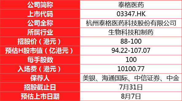 招股定价区间为每股88港元-100港元,每手100股,入场费约10100.77港元,预期将于7月31日定价,8月7日上市。