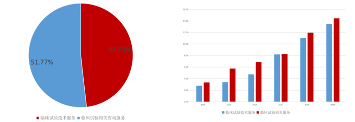 根据 wind,公司 2019 年临床试验技术服务和临床试验相关服务以及实验室服务营收占比分别为 48.23%和 51.77%,近几年两项服务营收占比约对半开。