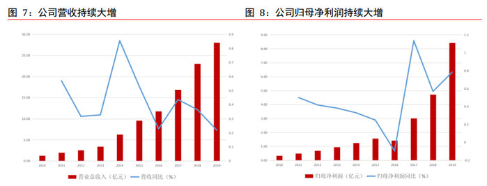 公司业绩持续快速增长,从 2014 年至 2019 年,技术服务营收从2.77亿元上升到13.47亿元,CAGR 为37.21%;相关服务和实验室服务营收从3.34亿元上升到14.46亿元,CAGR 为34.06%。