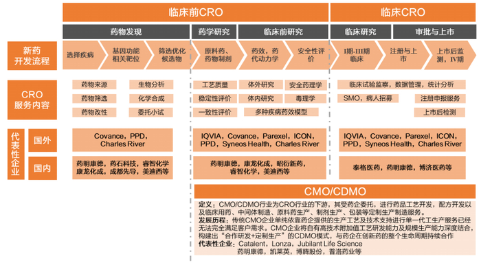 首先定义上合同研究组织(Contract Research Organization, CRO)为制药、生物技术和医疗器械公司以及政府、学术机构和其他研究实体提供一系列服务,负责实施药物研发过程所涉及的全部或部分活动,以获取商业性的报酬,整个行业具有很大的发展空间。