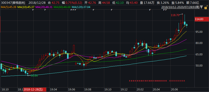 观察泰格医药在A股过往2年的走势,其涨幅非常可观。2019年初,泰格医药的股价低位还只有36元,到2020年7月股价就已经暴涨至最高118.7元,按照前复权区间最大涨幅可达389%!