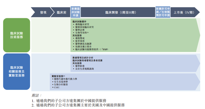 公司提供创新药物、仿制药及医疗器械临床试验运作服务以及与临床试验直接相关的配套服务,包括医学撰写、翻译及注册服务、以及药物警戒服务。